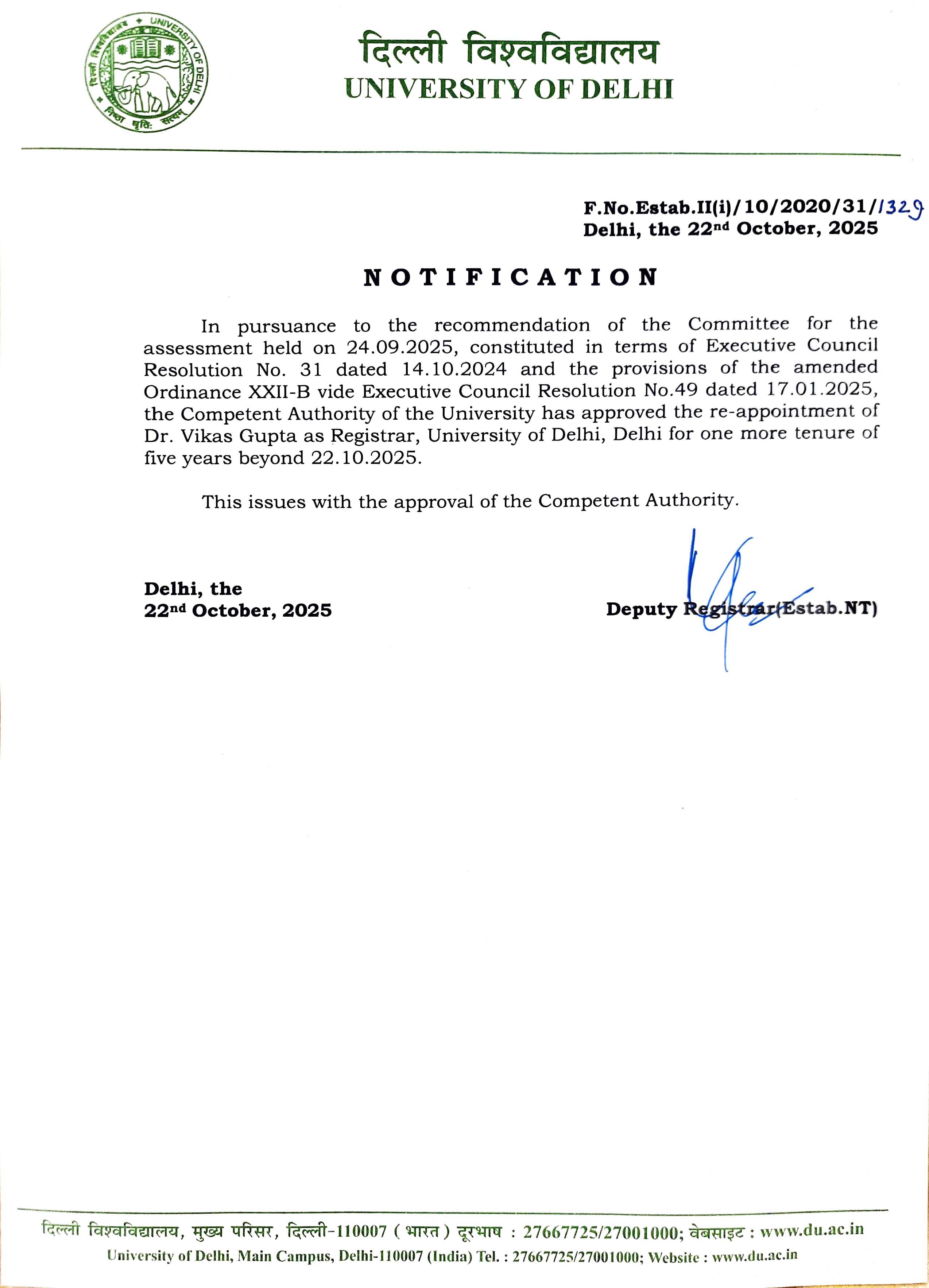 Notification Regarding re-appointment of the Registrar, University of Delhi