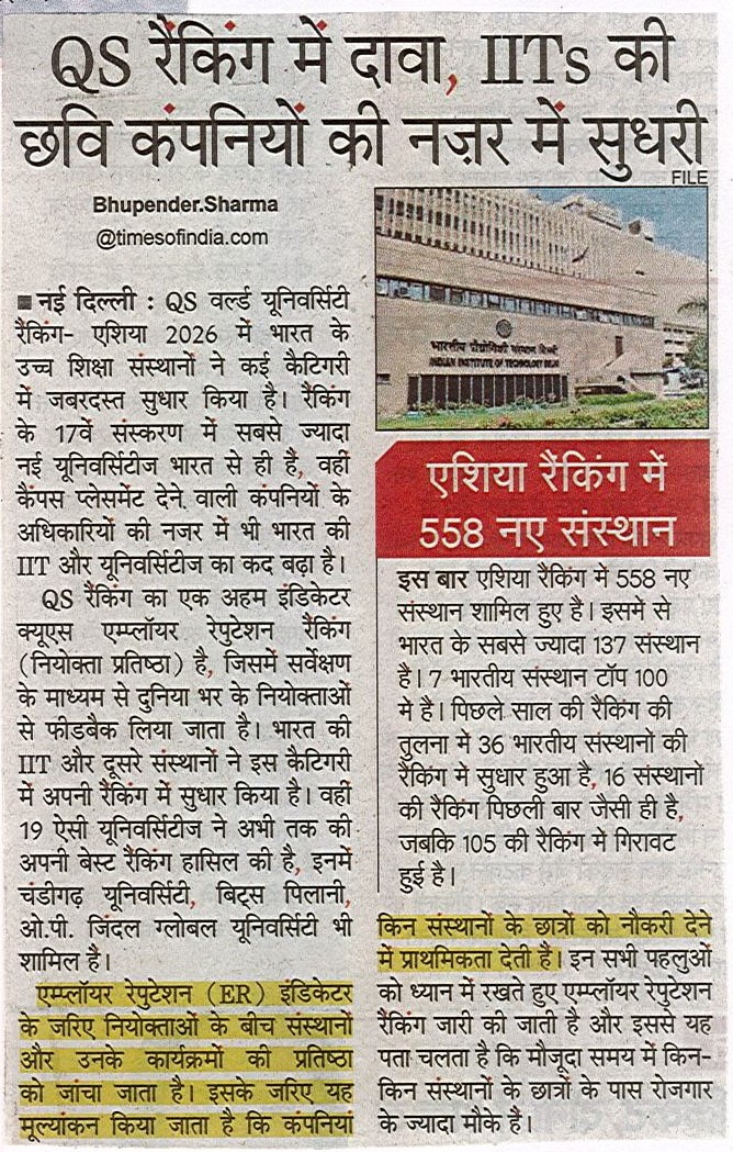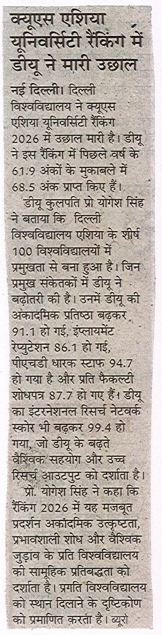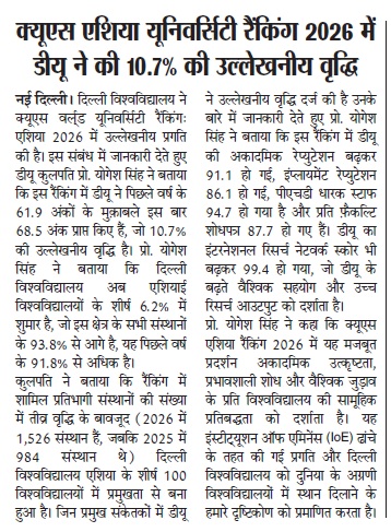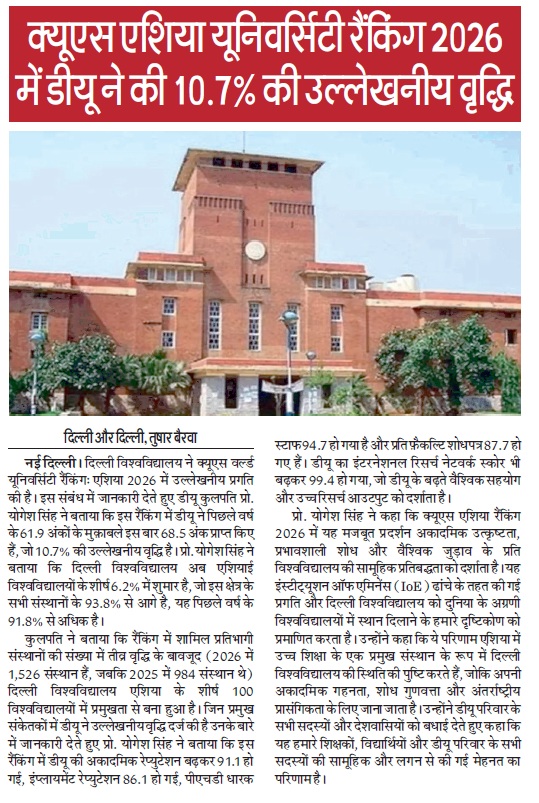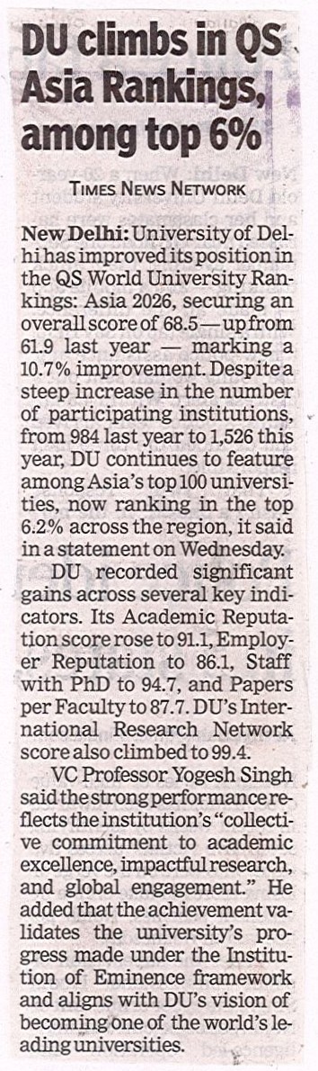 Professor Yogesh Singh, Vice-Chancellor of the University of Delhi, said this strong performance in the QS Asia Rankings 2026 reflects the University’s collective commitment to academic excellence, impactful research, and global engagement. It validates the progress made under the Institution of Eminence (IoE) framework and our vision to position Delhi University among the world’s leading universities.