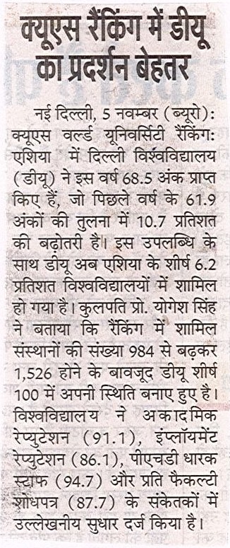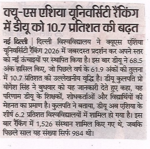क्यूएस एशिया यूनिवर्सिटी रैंकिंग 2026 में डीयू ने की 10.7% की उल्लेखनीय वृद्धि