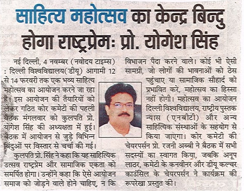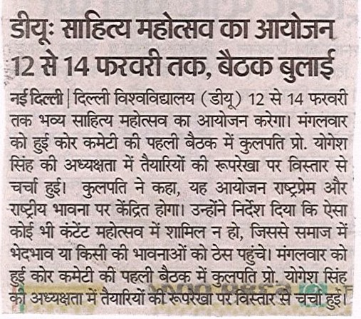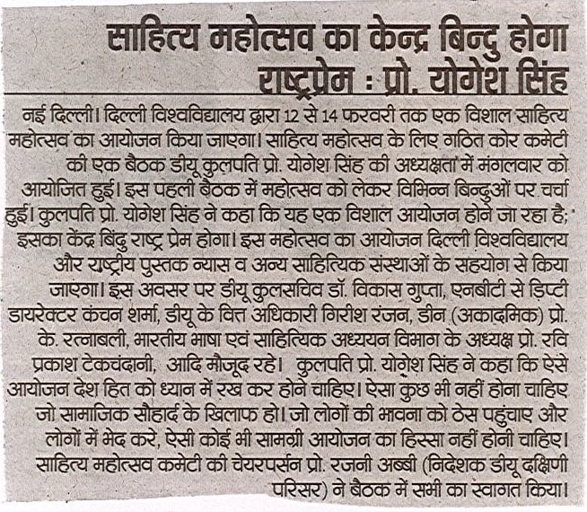 दिल्ली विश्वविद्यालय द्वारा 12 से 14 फरवरी तक एक विशाल साहित्य महोत्सव का आयोजन किया जाएगा। साहित्य महोत्सव के लिए गठित कोर कमेटी की एक बैठक डीयू कुलपति प्रो. योगेश सिंह की अध्यक्षता में मंगलवार को आयोजित हुई। इस पहली बैठक में महोत्सव को लेकर विभिन्न बिन्दुओं पर चर्चा हुई। कुलपति प्रो. योगेश सिंह ने कहा कि यह एक विशाल आयोजन होने जा रहा है; इसका केंद्र बिन्दु राष्ट्र प्रेम होगा। इस महोत्सव का आयोजन दिल्ली विश्वविद्यालय और राष्ट्रीय पुस्तक न्यास (एनबीटी) व अन्य साहित्यिक संस्थाओं के सहयोग से किया जाएगा।