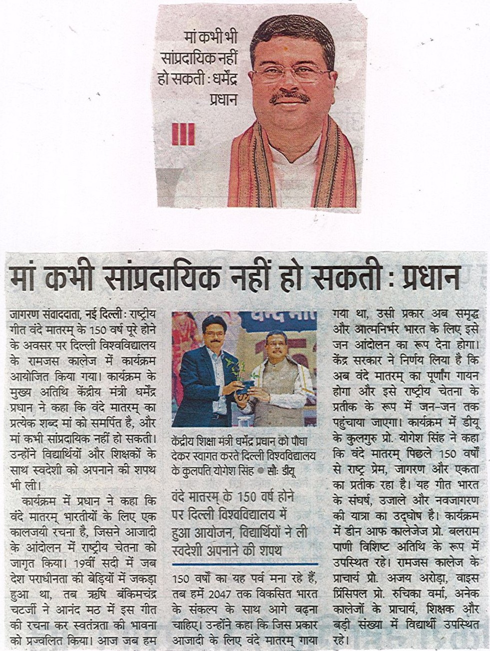 राष्ट्रीय गीत “वंदे मातरम” के 150 वर्ष पूरे होने के अवसर पर दिल्ली विश्वविद्यालय के रामजस कॉलेज में एक विशेष कार्यक्रम का आयोजन किया गया। इस कार्यक्रम में केंद्रीय शिक्षा मंत्री धर्मेंद्र प्रधान मुख्यातिथि रहे जबकि कार्यक्रम की अध्यक्षता डीयू कुलपति प्रो. योगेश सिंह ने की। इस अवसर पर डीन ऑफ कॉलेजेज़ प्रो. बलराम पाणी विशिष्ट अतिथि के तौर पर उपस्थित रहे। कार्यक्रम के दौरान केंद्रीय मंत्री धर्मेंद्र प्रधान ने अपने संबोधन में कहा कि वंदे मातरम का एक-एक शब्द माँ को समर्पित है, और माँ कभी सांप्रदायिक नहीं हो सकती। इस अवसर पर धर्मेंद्र प्रधान ने सामूहिक रूप से विद्यार्थियों और समूचे दिल्ली विश्वविद्यालय परिवार के साथ स्वदेशी संकल्प शपथ भी ली। कार्यक्रम को लेकर जानकारी देते हुए डीयू कुलपति प्रो. योगेश सिंह ने बताया कि डीयू में साल भर “वंदे मातरम” पर कार्यक्रमों का आयोजन किया जाएगा। इस दौरान डीयू के सभी कॉलेजों में कार्यक्रम आयोजित होंगे।