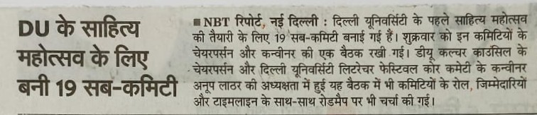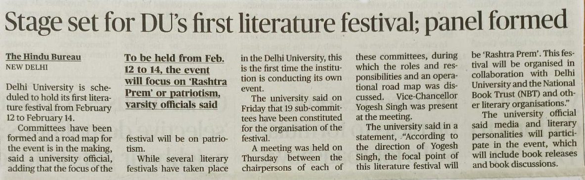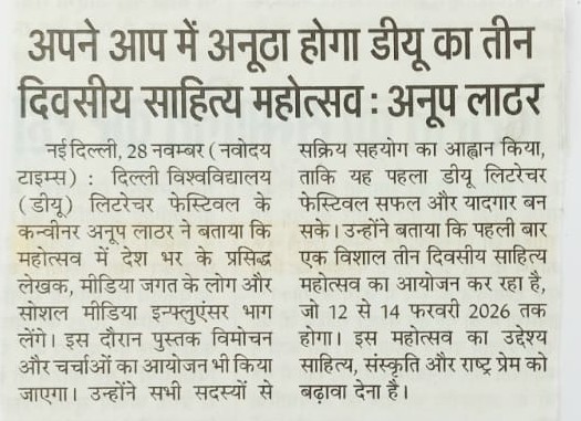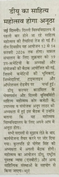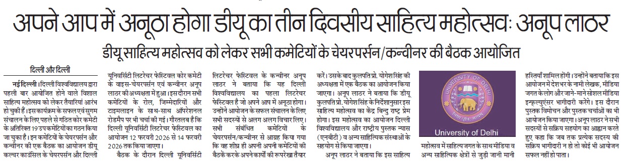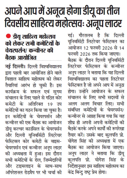 दिल्ली विश्वविद्यालय द्वारा पहली बार आयोजित होने वाले विशाल साहित्य महोत्सव को लेकर तैयारियां आरंभ हो चुकी हैं। इस कार्यक्रम के सफल एवं सुगम संचालन के लिए पहले से गठित कोर कमेटी के अतिरिक्त 19 उप कमेटियों का गठन किया जा चुका है। इन कमेटियों के चेयरपर्सन और कन्वीनर की एक बैठक का आयोजन डीयू कल्चर काउंसिल के चेयरपर्सन और दिल्ली यूनिवर्सिटी लिटरेचर फेस्टिवल कोर कमेटी के वाइस-चेयरपर्सन एवं कन्वीनर अनूप लाठर की अध्यक्षता में हुआ। इस दौरान सभी कमेटियों के रोल, जिम्मेदारियों और टाइमलाइन के साथ-साथ ऑपरेशनल रोडमैप पर भी चर्चा की गई। गौरतलब है कि दिल्ली यूनिवर्सिटी लिटरेचर फेस्टिवल का आयोजन 12 फरवरी 2026 से 14 फरवरी 2026 तक किया जाएगा।