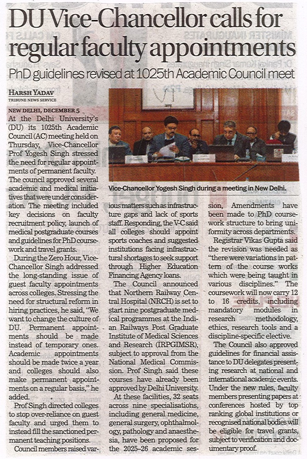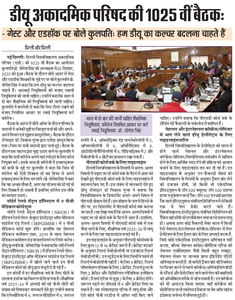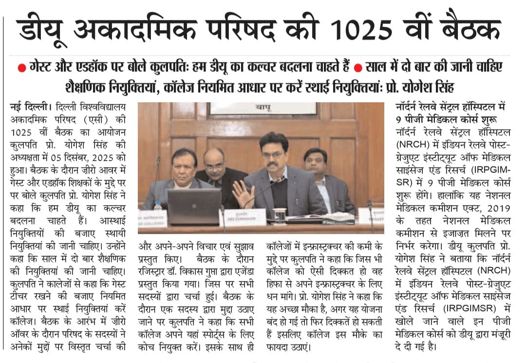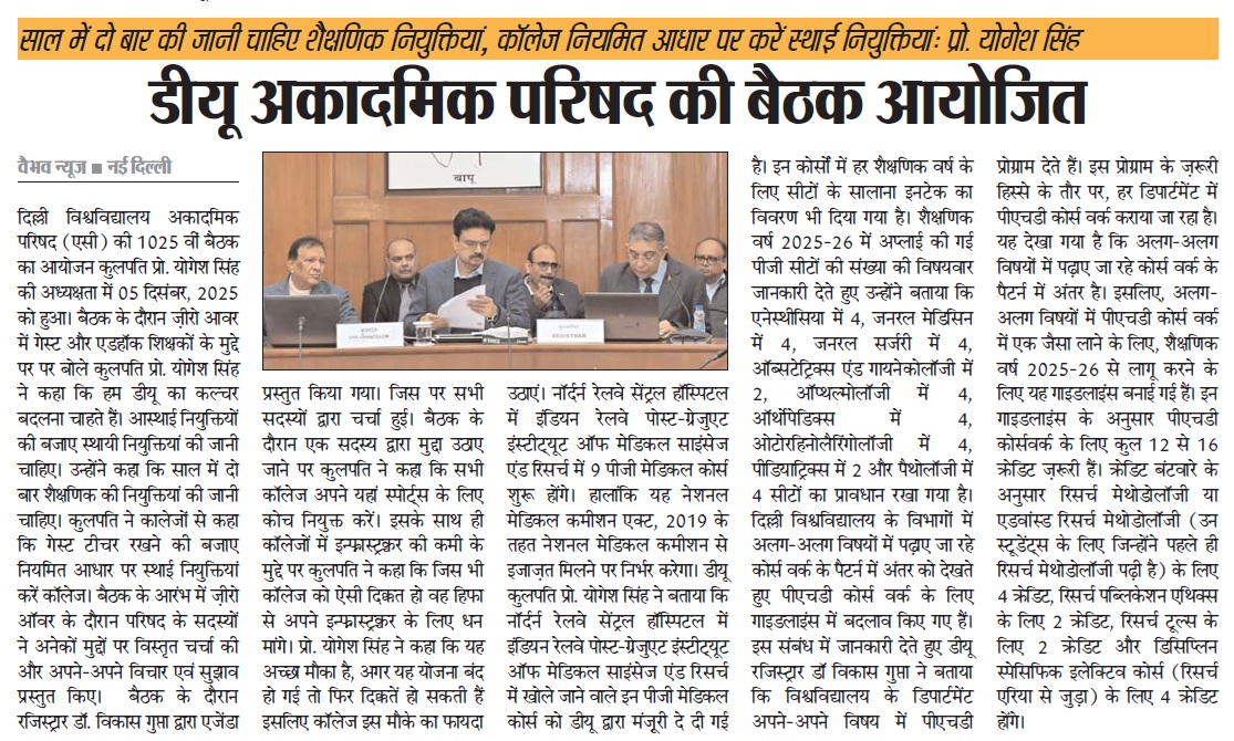 दिल्ली विश्वविद्यालय अकादमिक परिषद (एसी) की 1025 वीं बैठक का आयोजन कुलपति प्रो. योगेश सिंह की अध्यक्षता में 05 दिसंबर, 2025 को हुआ।