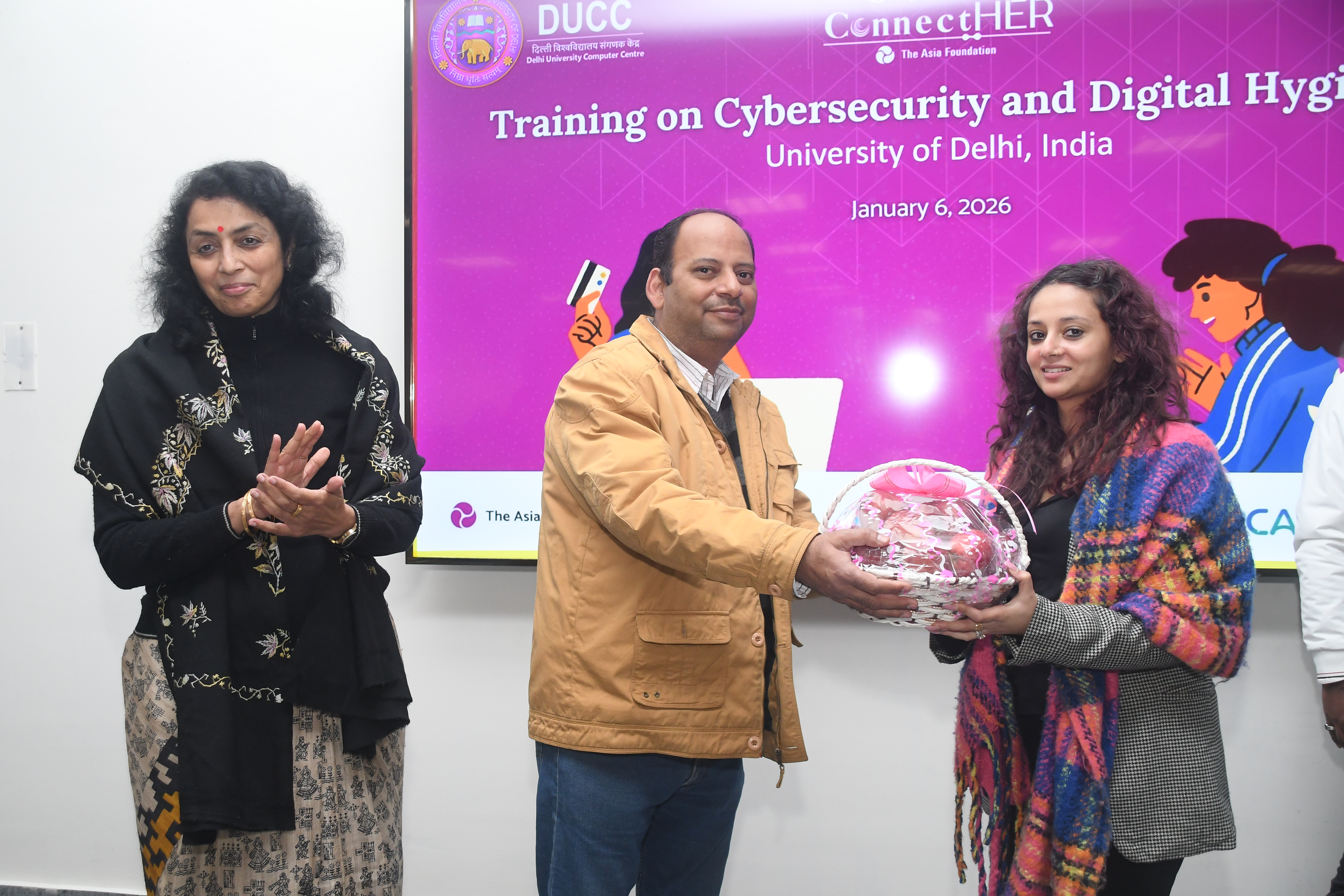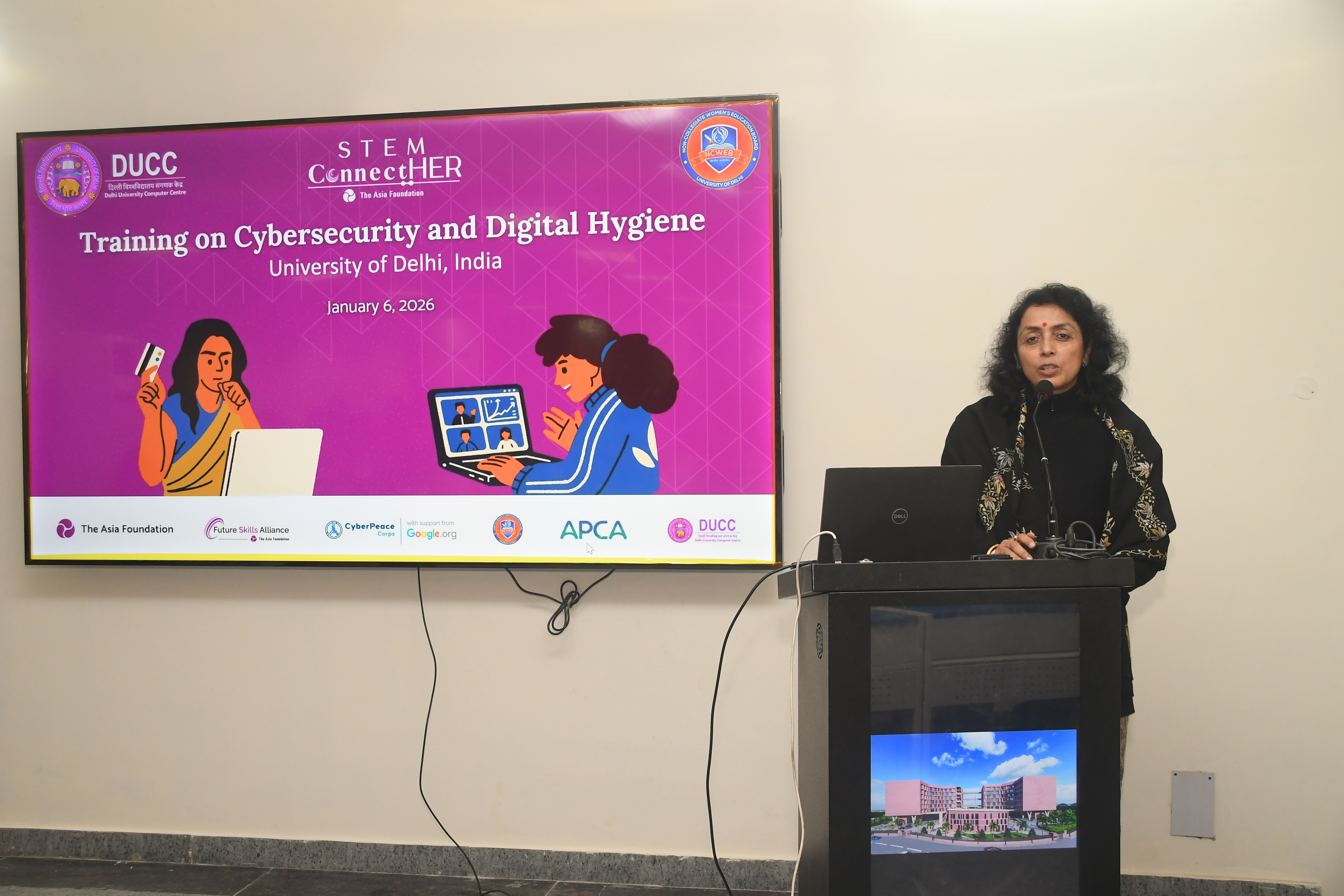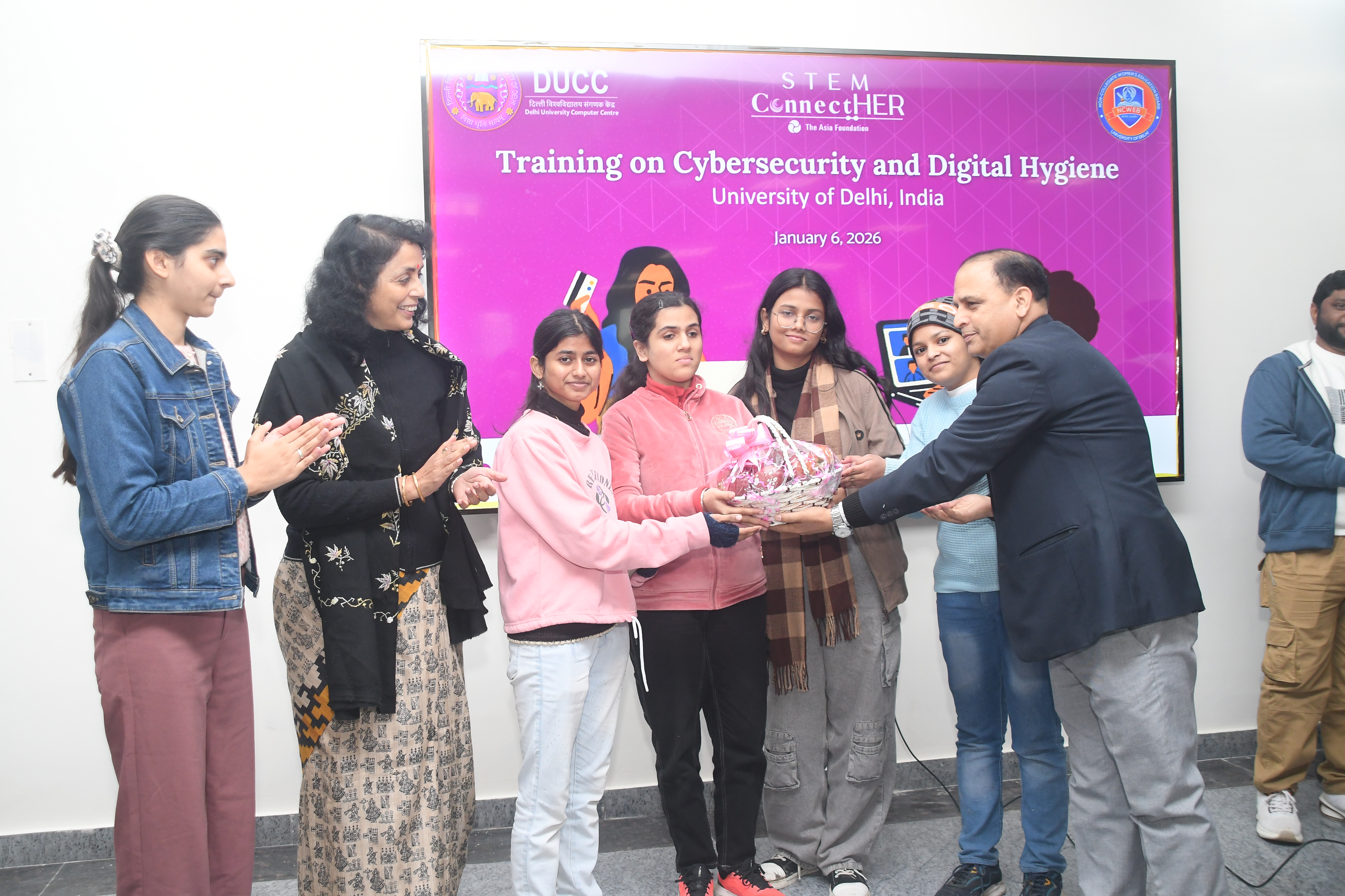 A half-day Training Program on Cyber Security and Cyber Hygiene for girl students was successfully conducted at the University of Delhi on January 6, 2026, under the STEM Connect HER program. The program was organised by the Delhi University Computer Centre (DUCC) and the Non-Collegiate Women Education Board (NCWEB) in collaboration with the Asia Foundation and CyberPeace. The training witnessed the enthusiastic participation of 134 girl students of STEM Courses from various departments and colleges of the University of Delhi, including the Faculty of Technology, Non-Collegiate Women Education Board (NCWEB), Cluster Innovation Centre, Institute of Informatics & Communication, Daulat Ram College, PGDAV College, Acharya Narendra Dev College (ANDC), College of Vocational Studies, Aryabhatta College, Maitreyi College, Mata Sundri College, Shyama Prasad Mukherji College, Bhaskaracharya College of Applied Sciences, among others. The program aimed to equip students with essential knowledge, tools, and reliable resources to protect themselves from emerging cyber threats. Participants were sensitized to risks such as deepfakes, online frauds, and data breaches, and were guided on practical steps to enhance their digital safety. Students were also encouraged to participate in cybersecurity hackathons and hands-on learning events. The session was highly interactive, fostering active discussions and engagement, and empowering young women to navigate the digital space safely and confidently.