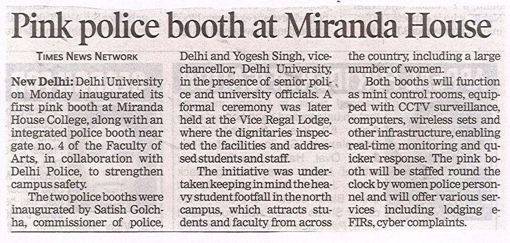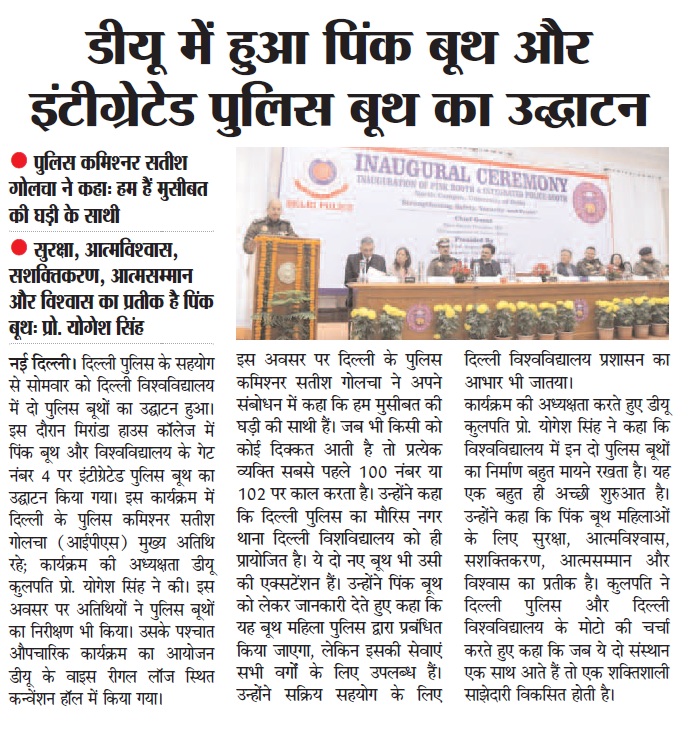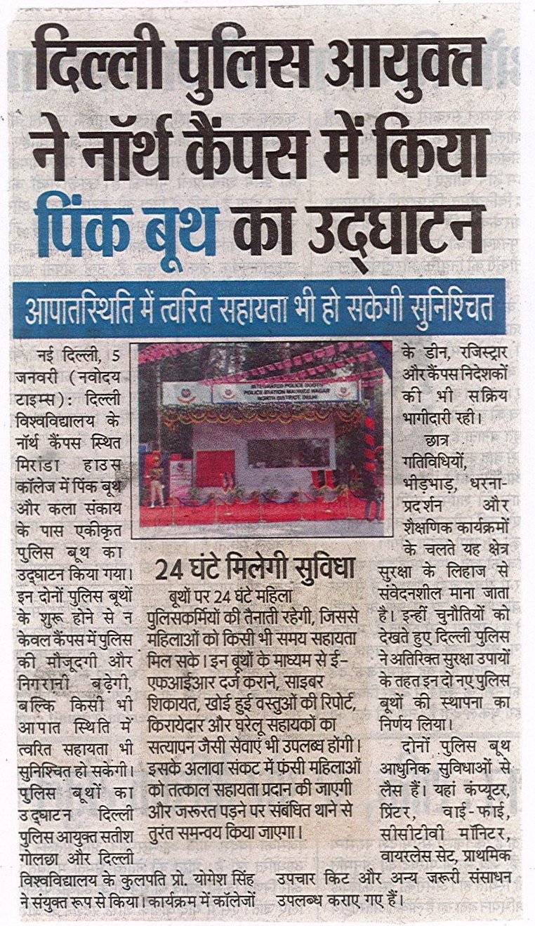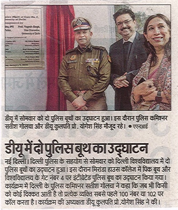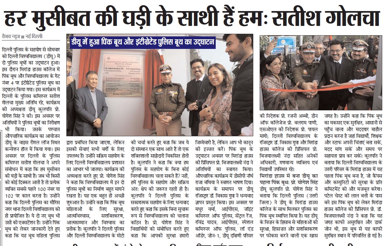 दिल्ली पुलिस के सहयोग से सोमवार को दिल्ली विश्वविद्यालय में दो पुलिस बूथों का उद्घाटन हुआ। इस दौरान मिरांडा हाउस कॉलेज में पिंक बूथ और विश्वविद्यालय के गेट नंबर 4 पर इंटीग्रेटेड पुलिस बूथ का उद्घाटन किया गया। इस कार्यक्रम में दिल्ली के पुलिस कमिश्नर सतीश