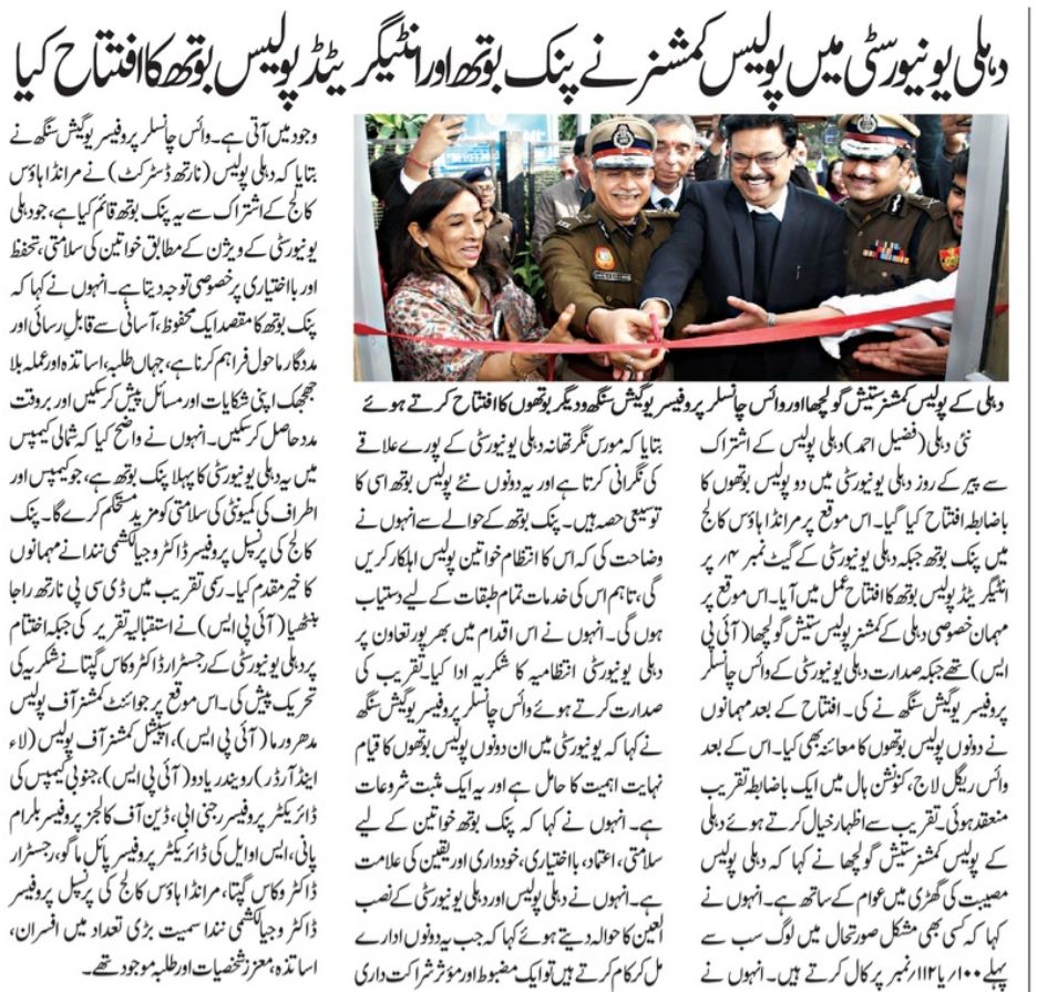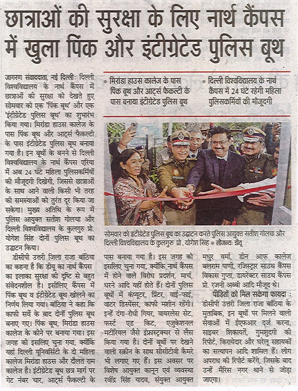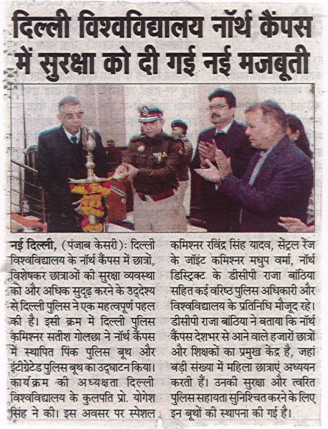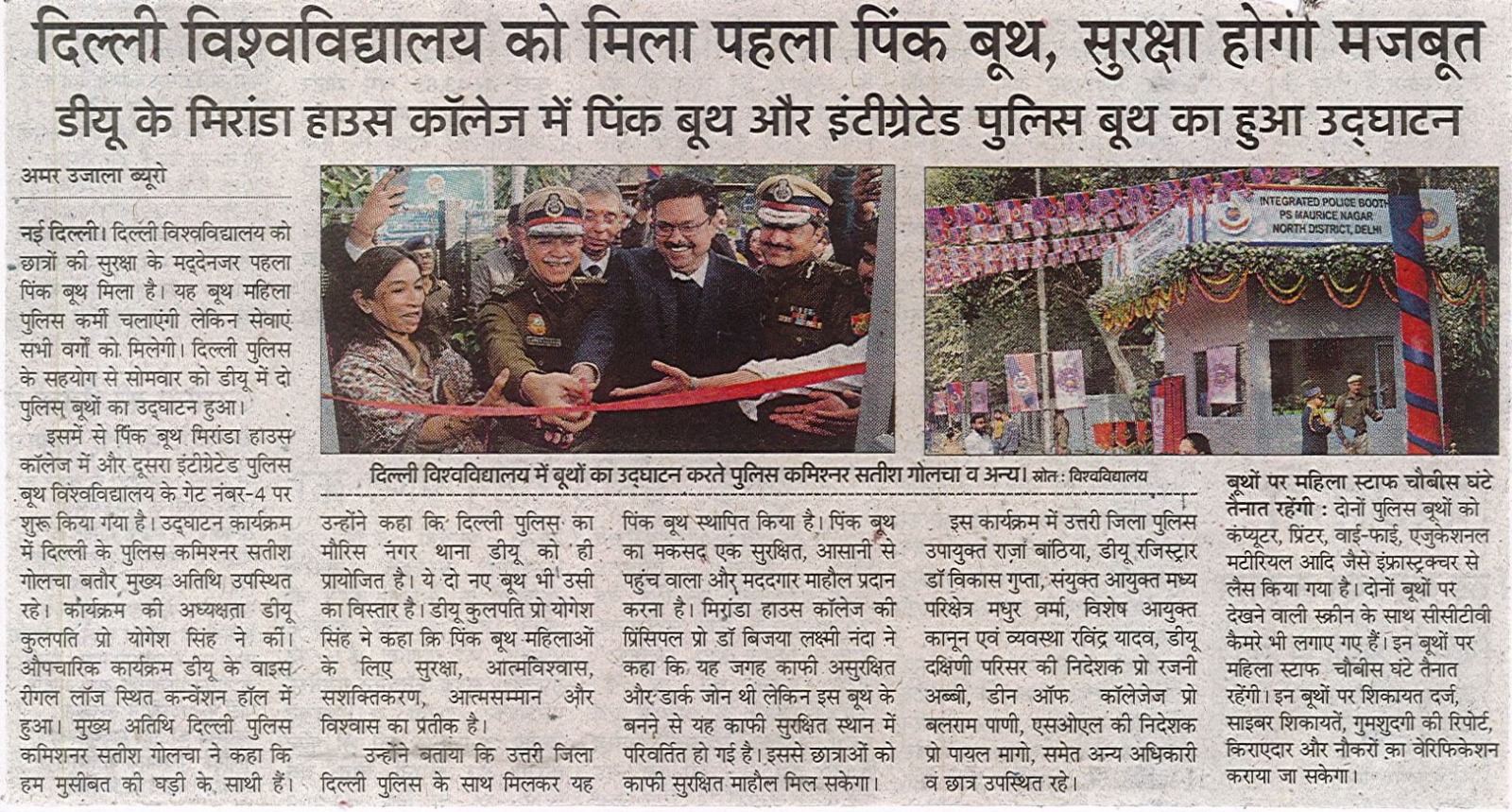 दिल्ली पुलिस के सहयोग से सोमवार को दिल्ली विश्वविद्यालय में दो पुलिस बूथों का उद्घाटन हुआ। इस दौरान मिरांडा हाउस कॉलेज में पिंक बूथ और विश्वविद्यालय के गेट नंबर 4 पर इंटीग्रेटेड पुलिस बूथ का उद्घाटन किया गया। इस कार्यक्रम में दिल्ली के पुलिस कमिश्नर सतीश