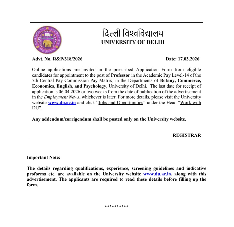 Advertisement No. R&P/318/2026 for the post of Professor : Extension of last date up to 25.04.2026 (Edit option is available till the last date of advertisement)