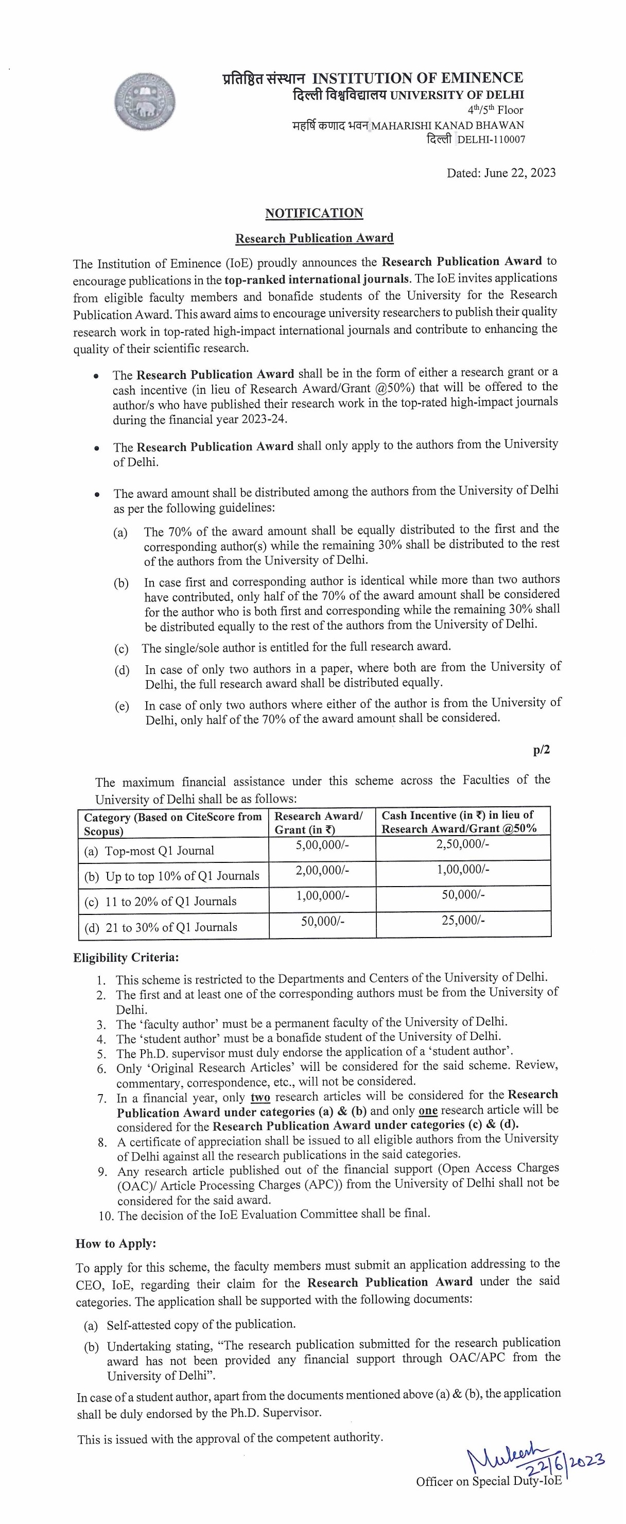 Notification regarding the Research Publication Award - Institutions of Eminence